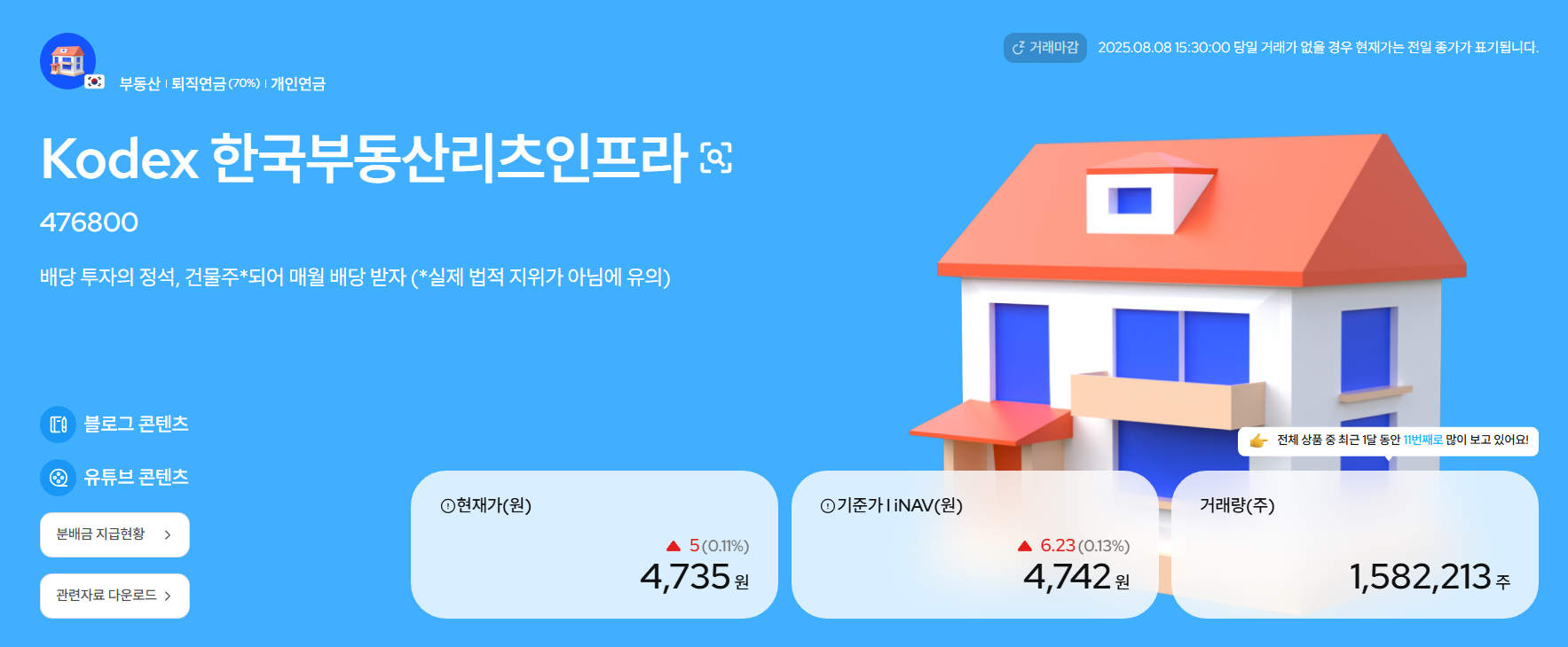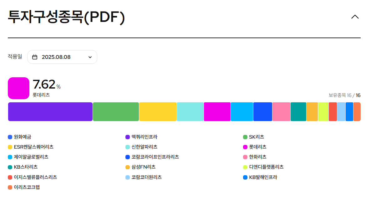 이 ETF는 국내 다양한 부동산 리츠(REITs)와 인프라 자산에 분산 투자하여 안정적인 배당과 장기 성장 가능성을 함께 노릴 수 있는 상품입니다.