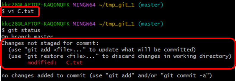 따라서 파일 C.txt에 대한 내용을 변경해보겠습니다. (아래 그림 참조) vim편집기를 사용하여 C.txt를 수정하고 git status을 보겠습니다. modified : C.txt라는 문구가 떠있습니다. git은 최신 커밋에 들어가 있는 파일들에 대해 추적을 하고, 변경 상항이 생긴 파일을 확인하여 수정된 폴더라는 것을 알려주게 됩니다. C.txt는 Tracked > modified 한 상태인 거죠