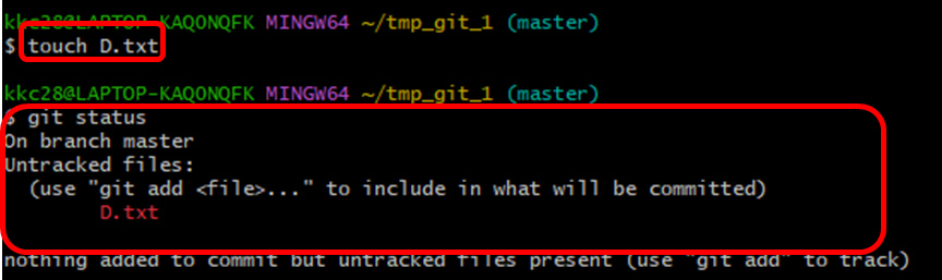 아래와 같이 touch 명령어로 D.txt 파일을 새롭게 생성해주면 D.txt는 현재 변경사항이 추적되지 않는 파일 상태가 됩니다. (Untracked file)